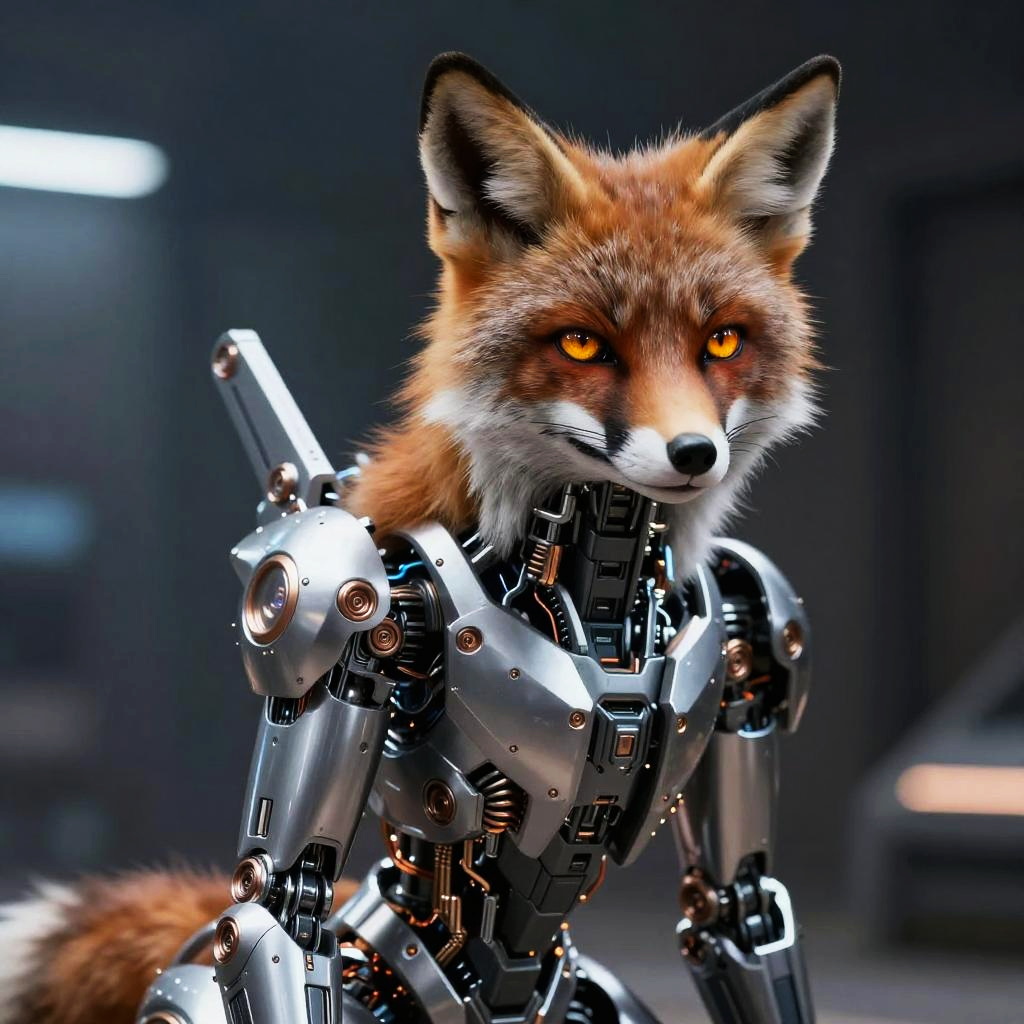 A highly detailed futuristic robotic Fox with realistic fur texture integrated into advanced mechanical cybernetic body parts, molten amber eyes with adaptive HUD overlays, stern vigilant expression, sleek silver and chrome metallic surfaces with intricate mechanical joints and glowing bronze accents, standing in a dimly lit high-tech environment