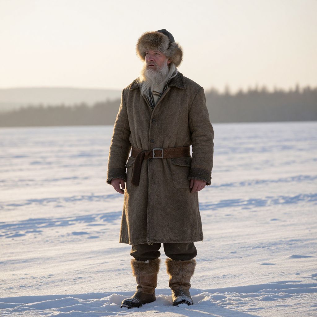 A man with a long, white beard and a weathered fur-lined hat is standing on a snowy, quiet winter landscape. He is wearing a brown, slightly worn coat with a thick belt, paired with sturdy, fur-trimmed boots. His posture is calm and composed, as if he's been standing there for a long time, observing the serene snow-covered world around him. The snow glistens under a soft, golden morning light, and the scene exudes a sense of stillness, mystery, and timeless solitude.