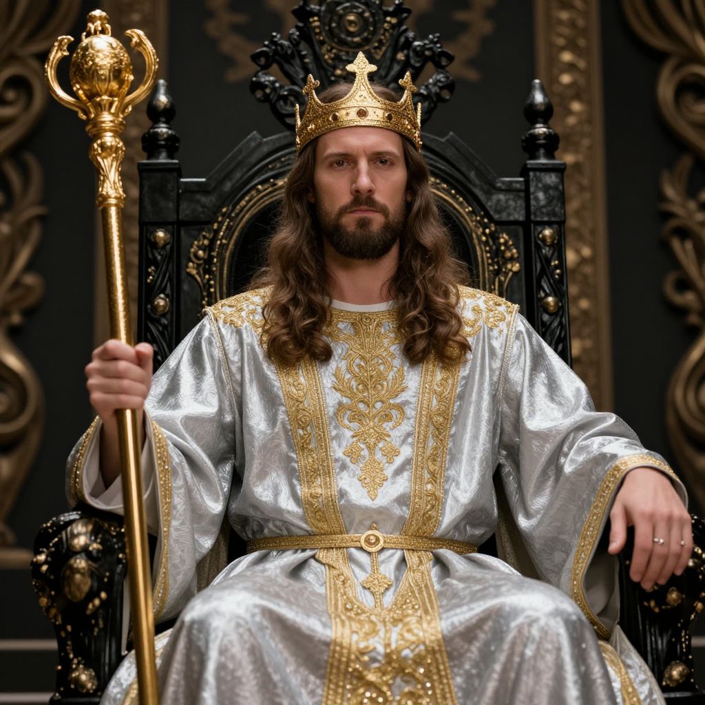 A photograph of a solemn-looking man with long brown hair and a beard, sitting on an ornate black throne with gold accents. He's wearing a shiny silver robe with intricate gold embroidery and a gold crown on his head. He's holding a golden staff with his right hand. The background is dark and ornate, adding to the regal vibe.