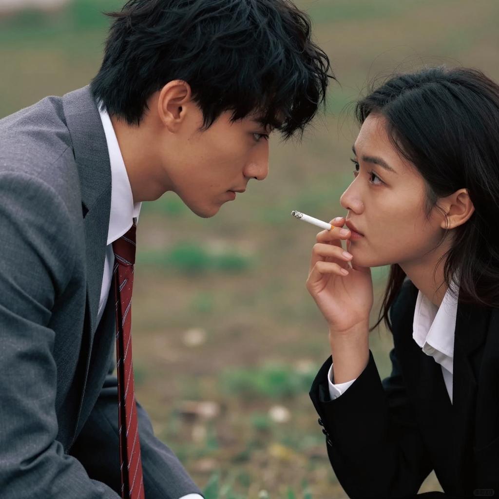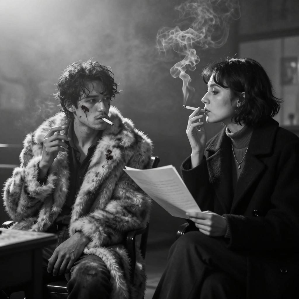 Black and white photograph of two people in a dimly lit room. Man on left, blood-stained, smoking cigarette, fur coat. Woman on right, short hair, smoking cigarette, holding papers. Man looks at woman. Foggy background. Both seated.