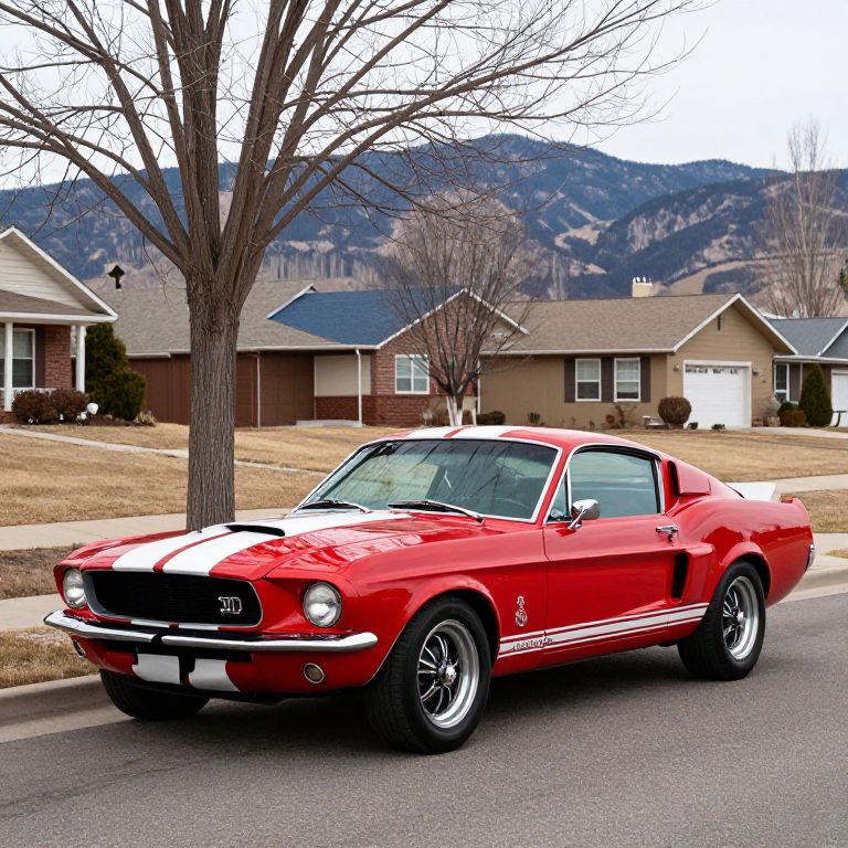 Shiny red 1968 Shelby GT500 with bold racing stripes parked prominently in front of a suburban backdrop featuring bare trees, distant mountains, and residential structures in Englewood, Colorado.