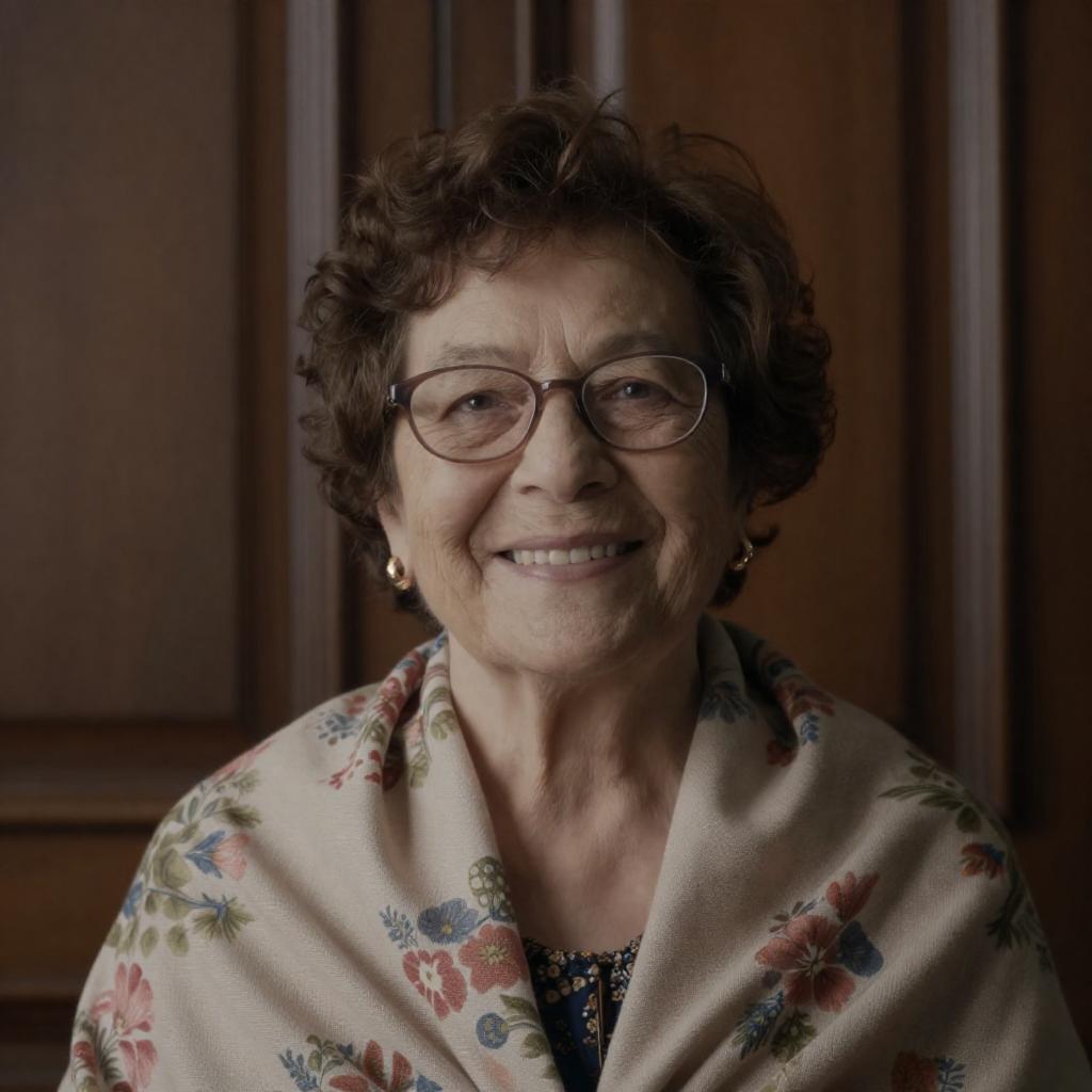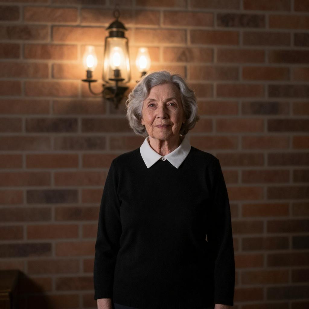 Old woman with short, wavy gray hair stands in dimly lit brick room, wearing black long-sleeve top and white collar. Lantern with three glowing bulbs illuminates her from behind. Soft, warm light creates gentle shadows. Her expression is calm. Brick wall background. Single person, centered in frame.