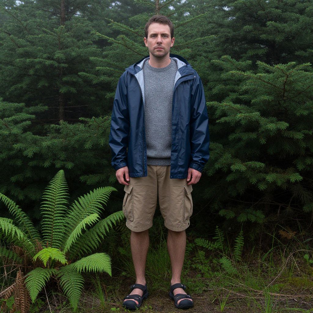 A man, insulated rain jacket, merino wool crew neck, convertible cargo shorts, cushioned hiking sandals, dense thickets of firs, misty air, vibrant green ferns at the base, cameraphone style, contemplative expression. Man has masculine face and piercing eyes