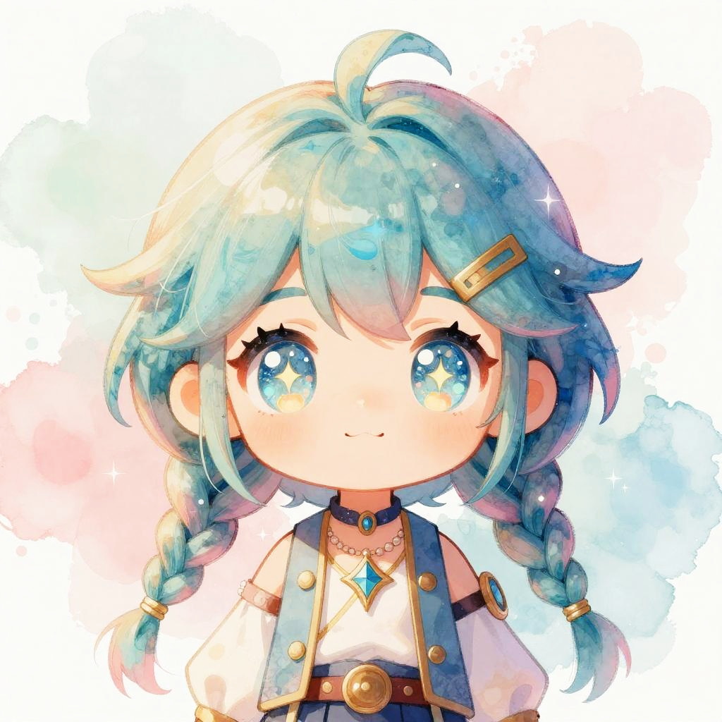 Character portrait creator free, anime-inspired character, large sparkling eyes, colorful hair with dynamic highlights, soft pastel background, digital watercolor brushstrokes, intricate costume design, whimsical and imaginative mood