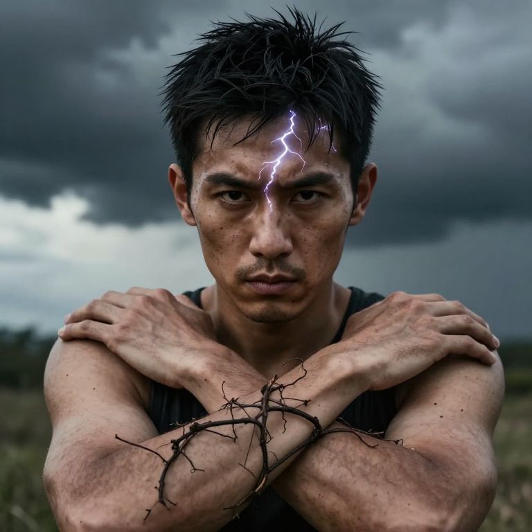 Photograph of a muscular Asian man with short, wet, black hair, standing outdoors against a cloudy, stormy sky. He has a striking, intense expression, with a vivid lightning bolt striking across his forehead. His arms are crossed over his chest, revealing tree branch-like cracks on his skin and arms. He is wearing a dark, sleeveless shirt. The image has a dramatic, surreal quality, with deep contrasts and a moody, stormy atmosphere. The background is slightly blurred, focusing attention on the man's face and arms.