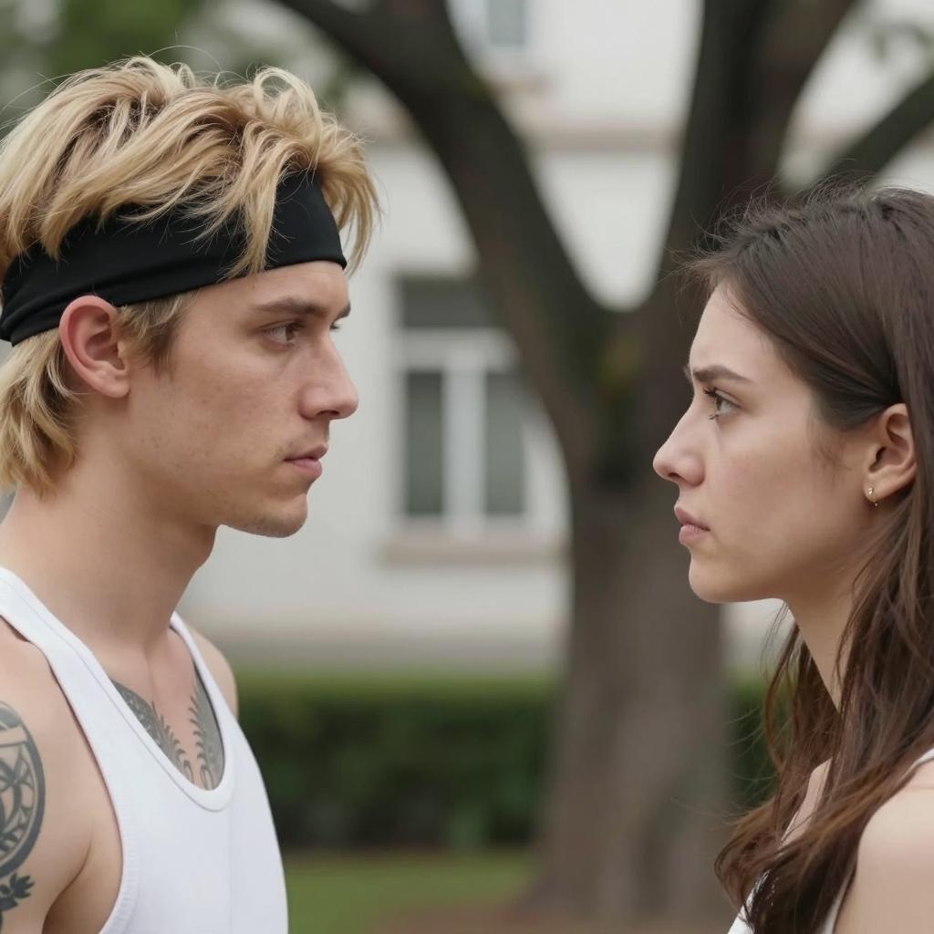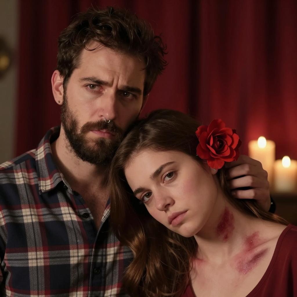 A photograph of a man and woman in an intimate moment. The woman with long brown hair, wearing a black top, holds the man's face with her right hand while her left arm wraps around his back. The man has medium-length brown hair, a beard, and wears a blue shirt with a black undershirt. Both look at each other intensely. The background shows a ured brown wall, a wooden door, and a blurred chair. The woman's right hand gently touches his cheek. The man's left hand rests on the woman's back.