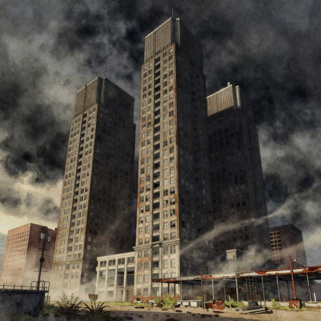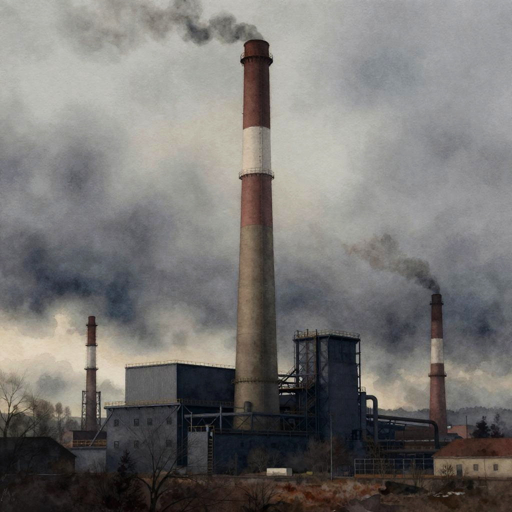 Watercolor illustration of an impossibly high industrial chimney in bleak Ruhr Valley, at dusk with mist and smoke in the air. Bleak desaturated colors, towering architecture, somber and introspective mood, atmospheric and highly detailed.