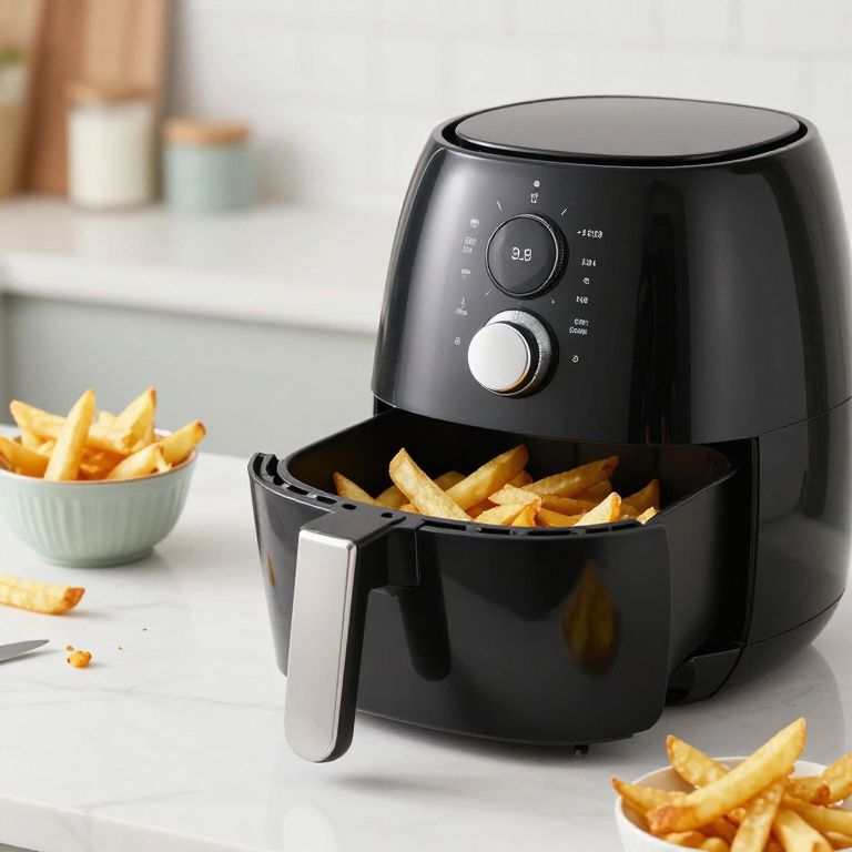 Silky air fryer,bowls of fries kitchen background, white surface, 8k. style of caroline losse profesional advertising photography,profesional food photography,
