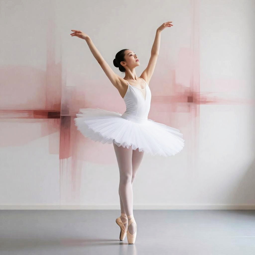 Photograph of a graceful ballet dancer in a white tutu and pointe shoes, standing en pointe with arms elegantly raised. The dancer has a slim, toned physique, fair skin, and dark hair in a neat bun. The background features a minimalist, modern-style wall with abstract red and pink brushstrokes. The dancer's face is turned slightly upward, with eyes closed in concentration. The lighting is soft, highlighting the dancer's form and creating a serene atmosphere. The image emphasizes the dancer's poise and the ethereal quality of ballet.