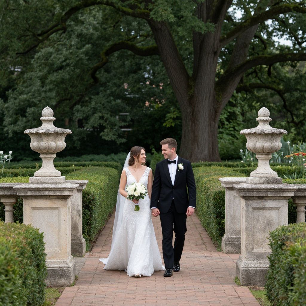 Elegantly dressed bride and groom walk hand-in-hand along a brick pathway flanked by symmetrical stone balustrades and manicured hedges, surrounded by lush greenery and towering trees in a serene garden setting.