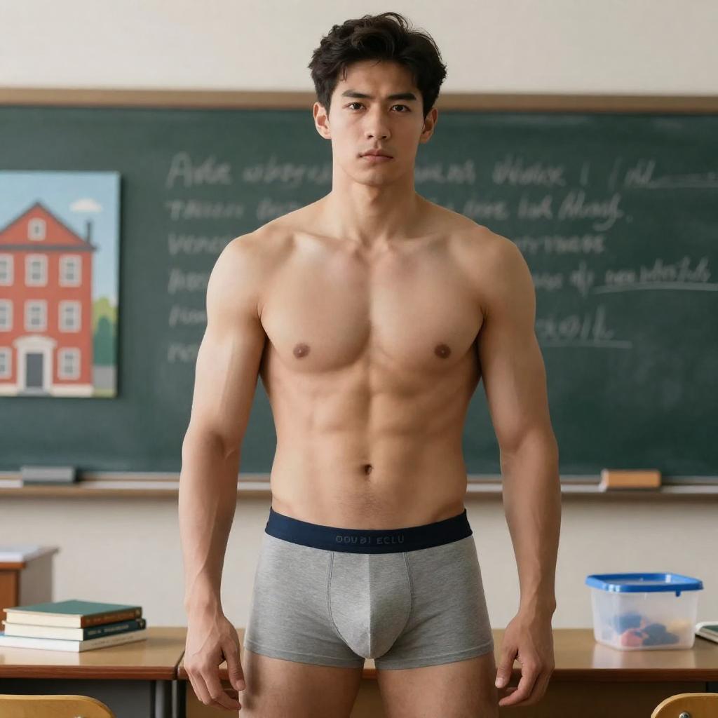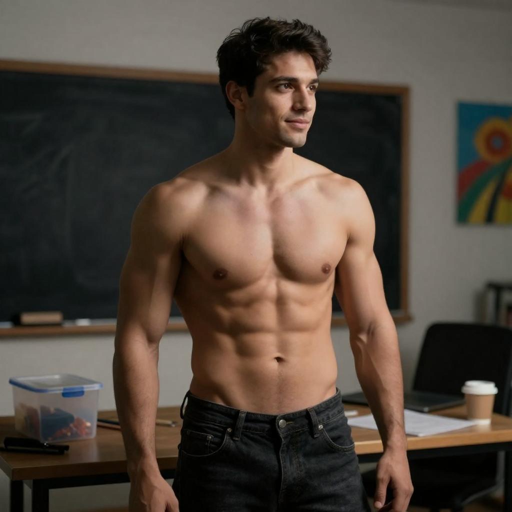 Photograph of a muscular, shirtless man with short dark hair, wearing gray boxer briefs, standing in a classroom. He has a defined chest and abs, and a slight smile. Behind him, a chalkboard and a painting of a red house are visible. A desk with books and a chair are in the foreground.