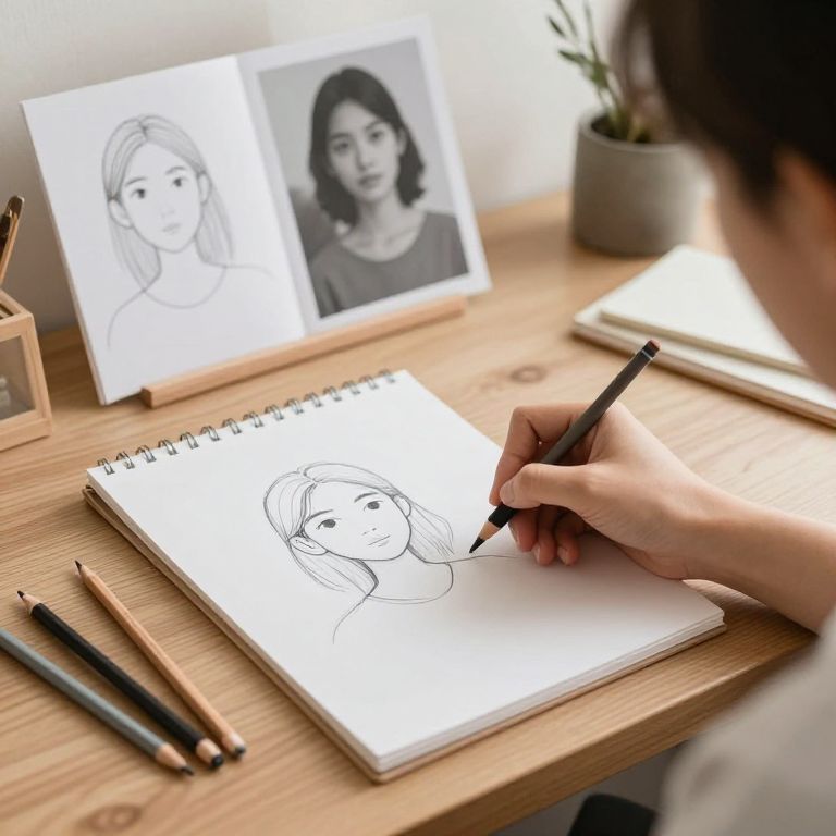 Close-up of an artist's hand drawing a simple pencil portrait in a sketchpad on a wooden table. In the background, there are reference photos of a young Asian woman with short hair, along with pencils and a plant. The setting is a minimalist, warmly lit art studio creating an inviting and creative atmosphere.