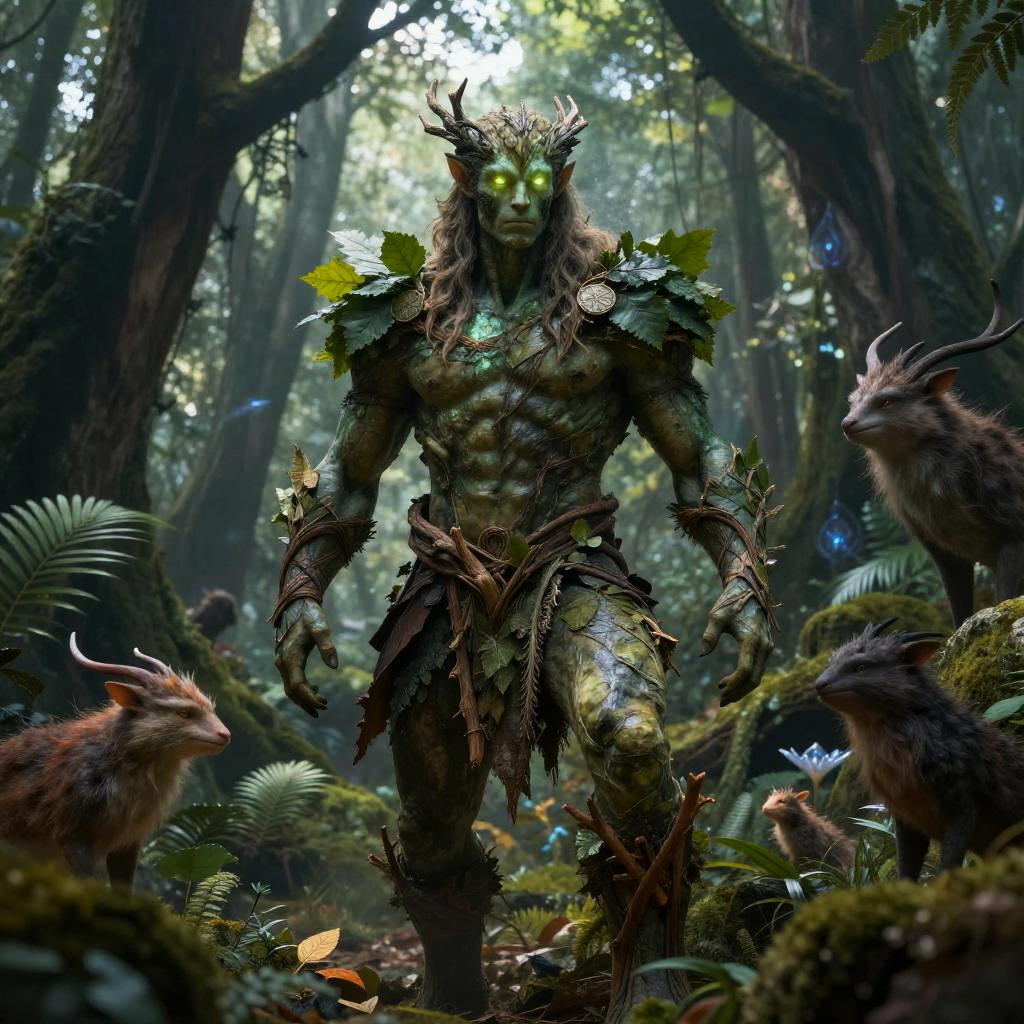 Leshy meaning portrayed through a surreal forest creature, mix of human and tree elements, eyes glowing with wisdom, surrounded by enchanted woodland animals and swirling leaves, twilight setting enhances mystical aura with sparkling fireflies and soft mossy ground.