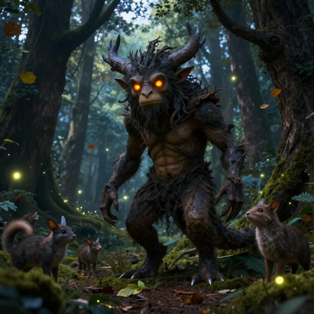 This digital fantasy artwork depicts a menacing, muscular, horned creature with glowing orange eyes and dark, shaggy fur standing in a dense, twilight forest. The creature's sharp claws and bared teeth add to its fierce appearance. Two small, grey, squirrel-like creatures with large ears and bushy tails stand alertly in the foreground, gazing up at the creature. The forest is lush with green moss-covered trees, scattered leaves, and small, glowing, fairy-like lights floating in the air. The background is filled with tall, dark trees, creating a mysterious and eerie atmosphere. The artist uses detailed textures and dynamic lighting to enhance the fantastical and ominous mood.