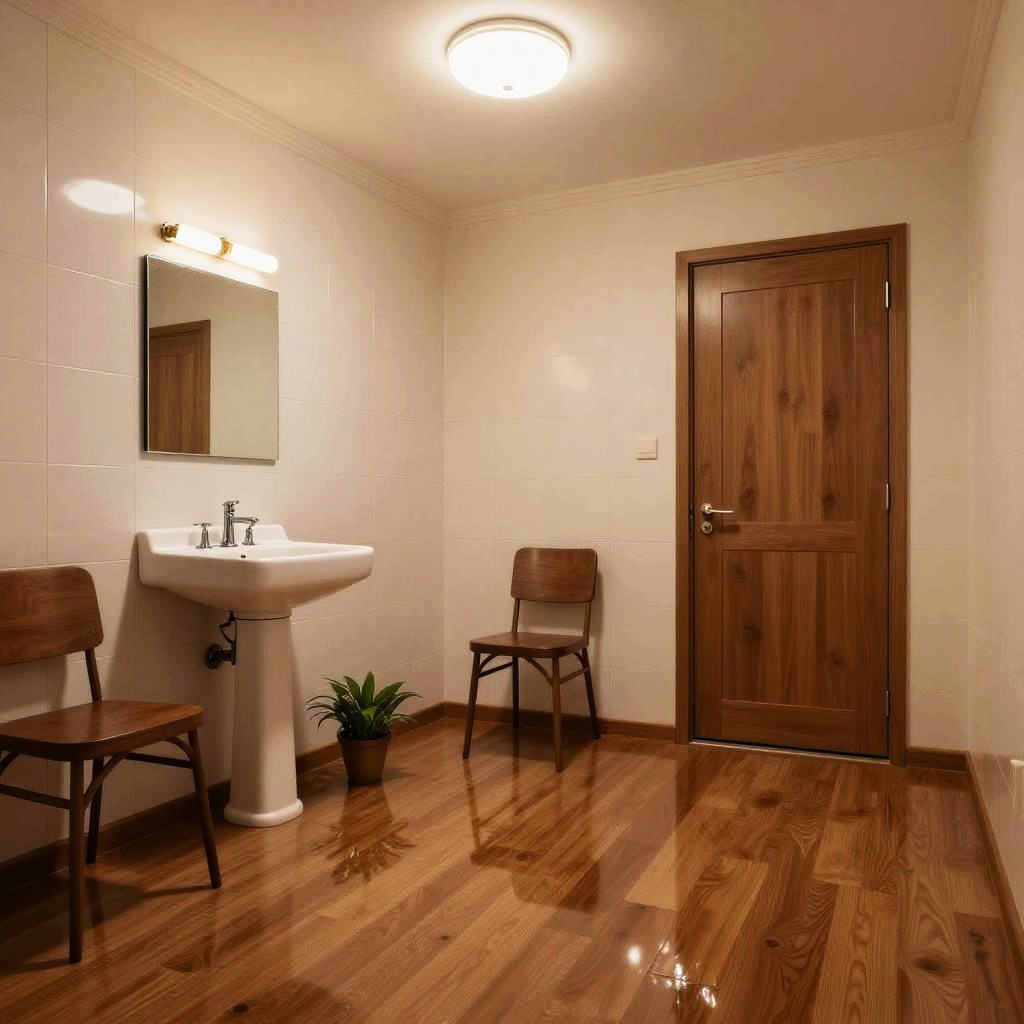 No humans, scenery, indoors, sink, wooden floor, ceiling light, chair, reflective floor, door, tiles, plant, (masterpiece), (high quality), best quality, real, (realistic), super detailed, (full detail), (4k), 8k