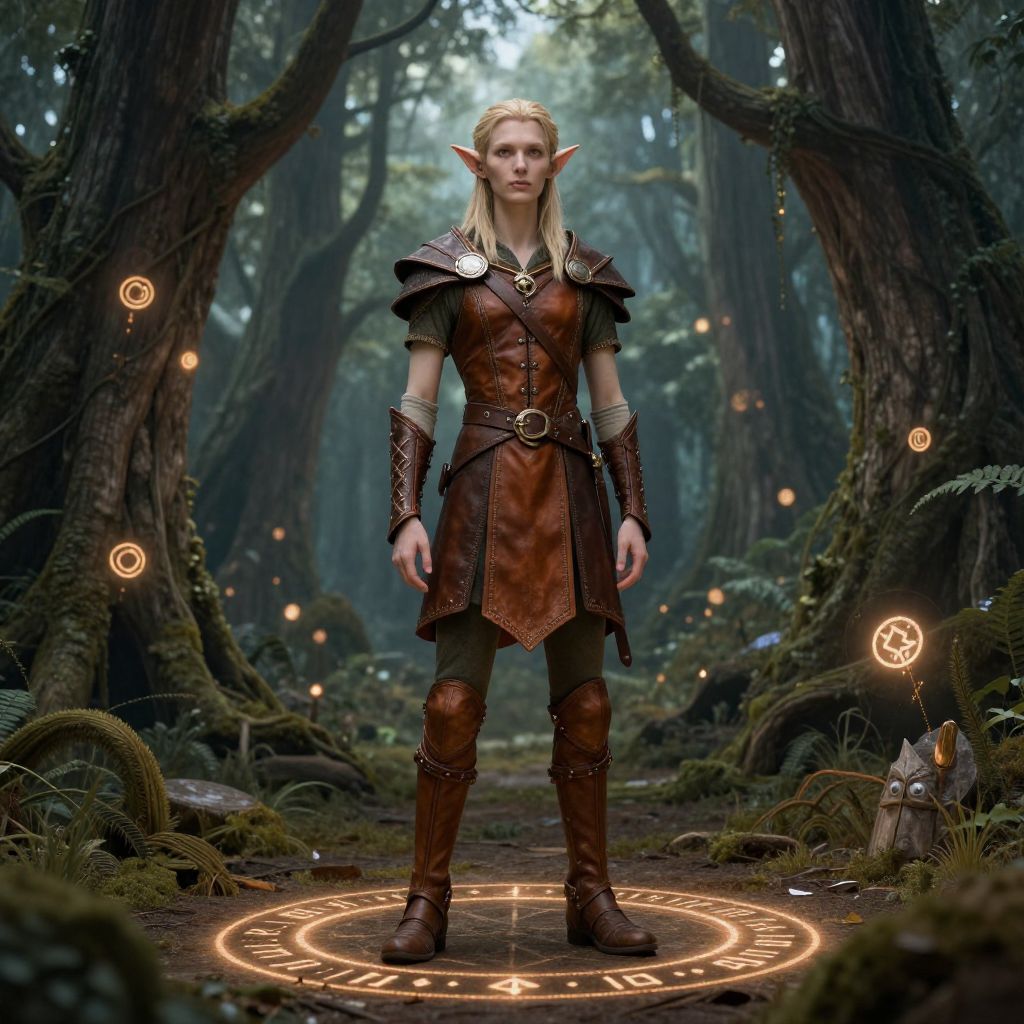 Elf height DnD character standing in a mystical forest, slender and tall with pointed ears, wearing elegant leather armor, surrounded by ancient trees and glowing runes, magical atmosphere, detailed fantasy art style.