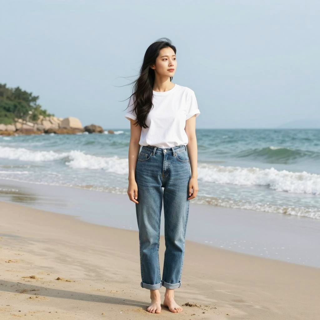 A young Asian woman with long black hair stands barefoot on a sandy beach beside the ocean. She is wearing a plain white t-shirt and rolled-up blue jeans, looking contemplatively into the distance. The coastal scene includes gentle waves and rocky shoreline under a clear sky.
