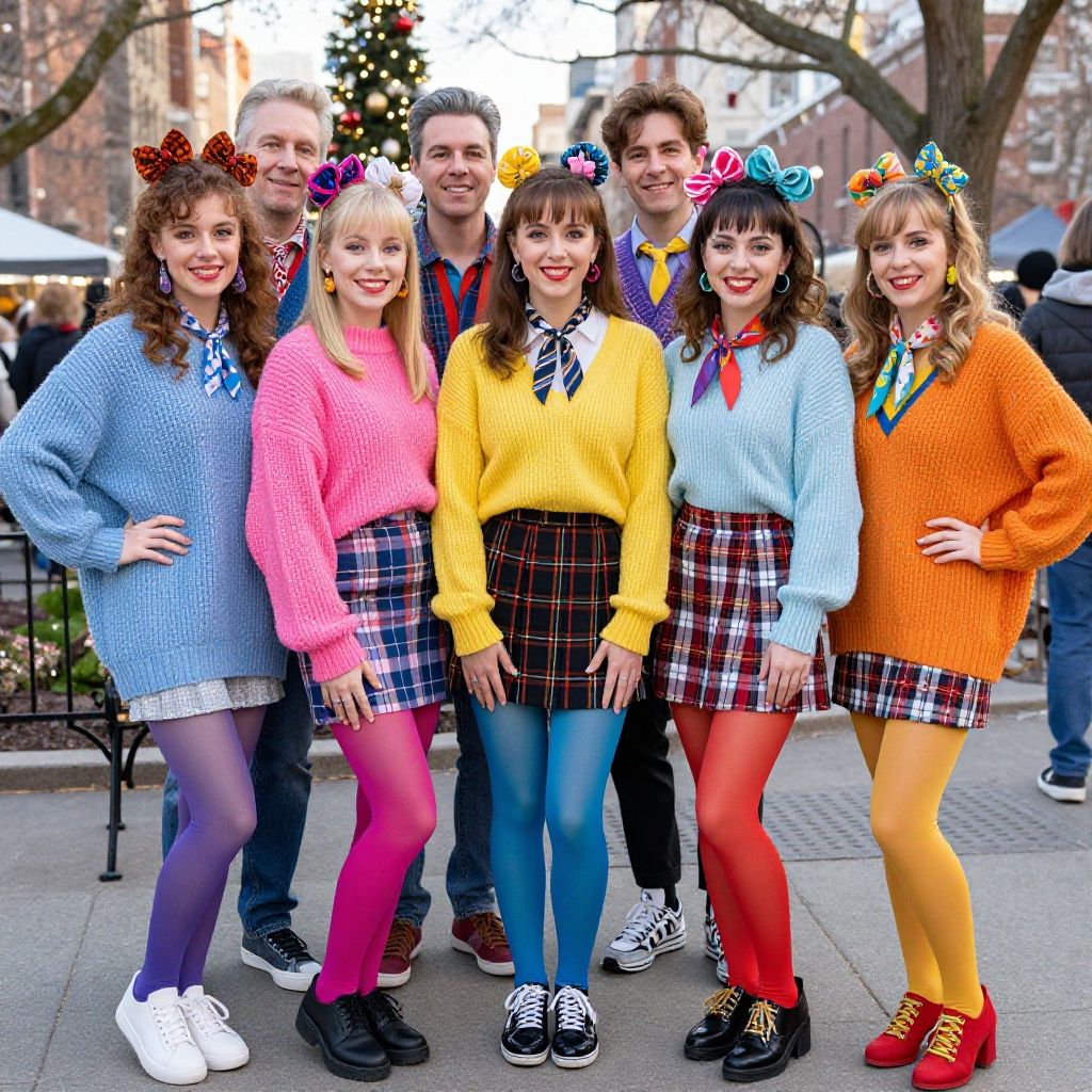 Adults dressed in Punky Brewster costume, iconic 80s style with layered clothing, pastel sweaters over graphic tees, striped socks, high-top sneakers, big hair with scrunchies, set in a lively city park with graffiti walls, playful and energetic atmosphere