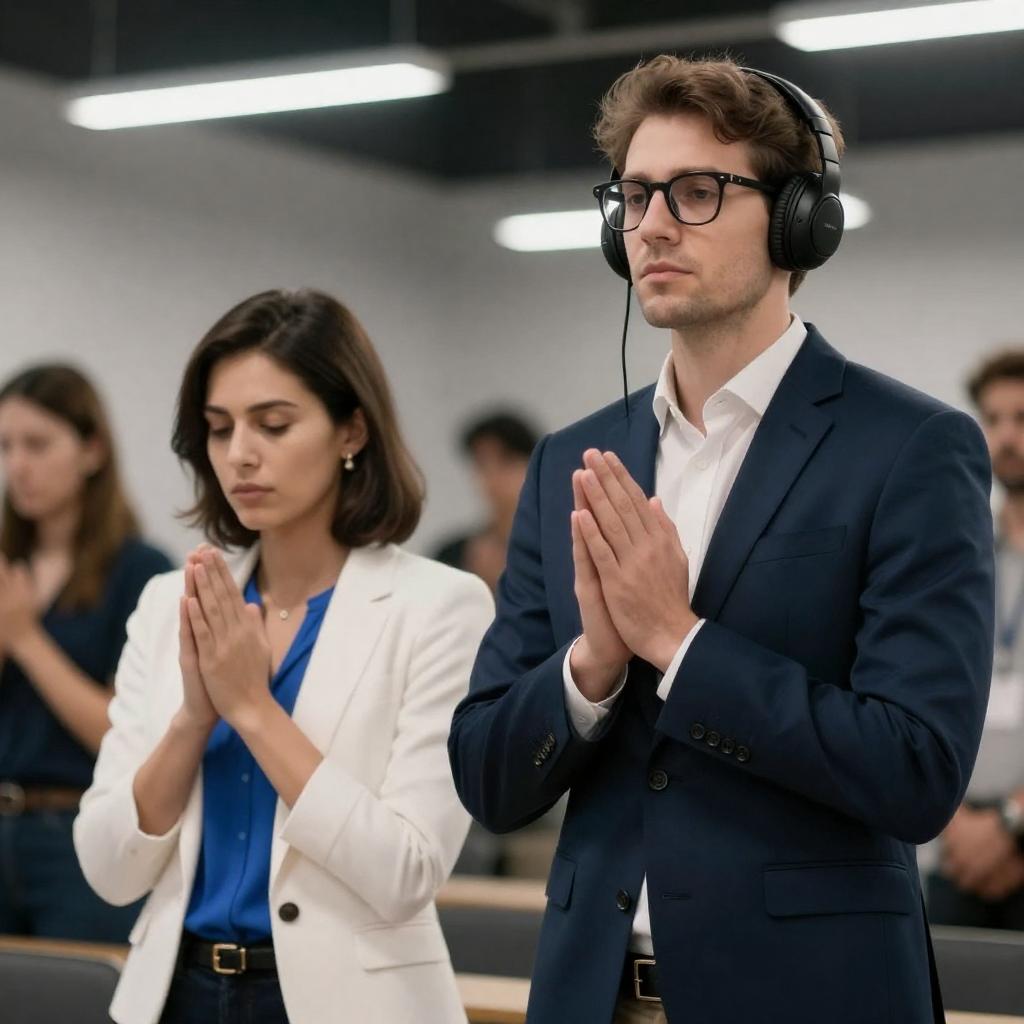 Photograph of a man in a navy blue suit with glasses and headphones, standing next to a woman in a white blazer and blue top, hands clasped in prayer. Background includes blurred people and a modern, industrial setting with fluorescent lights. The man has a serious expression, while the woman looks focused.
