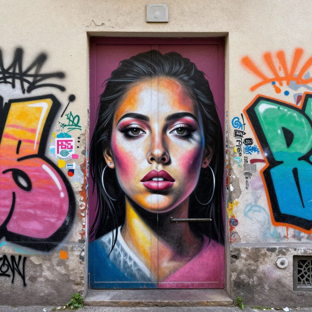 A striking street art piece by Matt Adnate, featuring a vividly detailed portrait of a woman's face painted on aBerlin doorway, surrounded by vibrant graffiti and bold colors, showcasing a blend of realism and urban artistry.