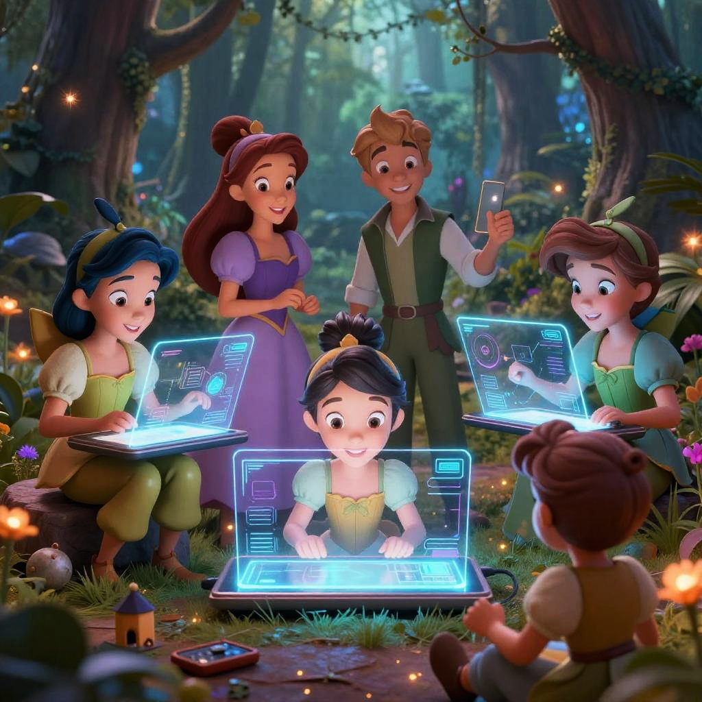 A vibrant illustration showing fake Disney movies AI at work, AI algorithms designing charming fairy tale characters on holographic tablets, enchanted forest backdrop, colorful magic sparks, combining traditional Disney style with futuristic AI elements, ultra-detailed