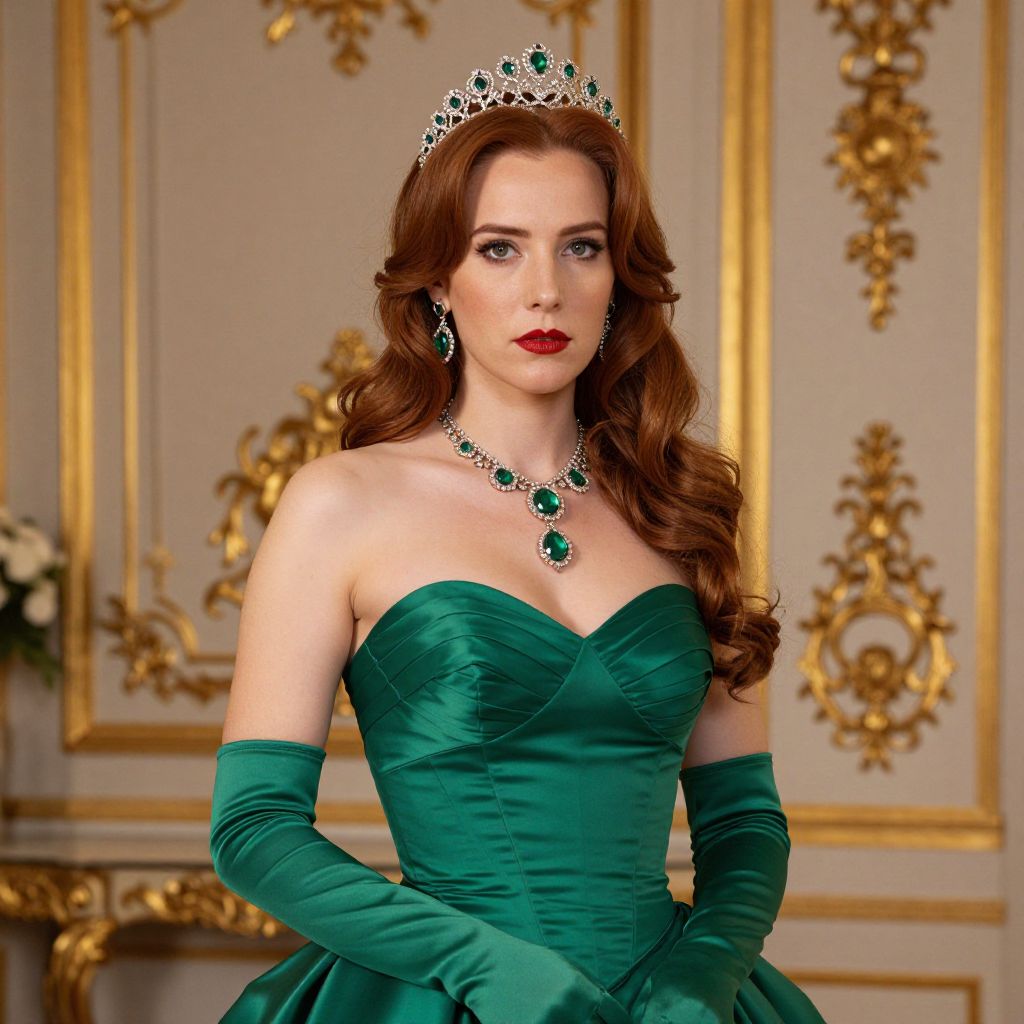Photograph of a fair-skinned woman with long, wavy auburn hair wearing a green, strapless, satin gown with matching elbow-length gloves. She has red lipstick, green gemstone necklace and earrings, and a jeweled tiara. Her expression is elegant and slightly serious. The background is an ornate, golden-accented room, adding a regal feel. The lighting highlights her features and the rich textures of her outfit.