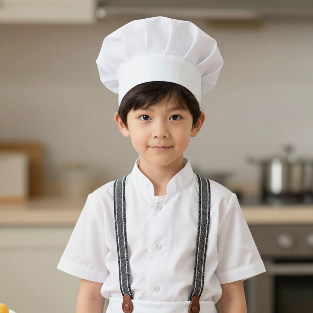 Photograph of an Asian boy, approximately 5-7 years old, standing in a kitchen. He has short black hair and is smiling gently. He is wearing a traditional white chef's uniform with a tall, pleated chef's hat, and black suspenders. His uniform is crisp with short sleeves and a buttoned collar. The background is a modern kitchen with blurred beige cabinets, a stainless steel oven, and a countertop. The lighting is bright and natural, highlighting the boy's innocent and focused expression. The overall style is candid and realistic.