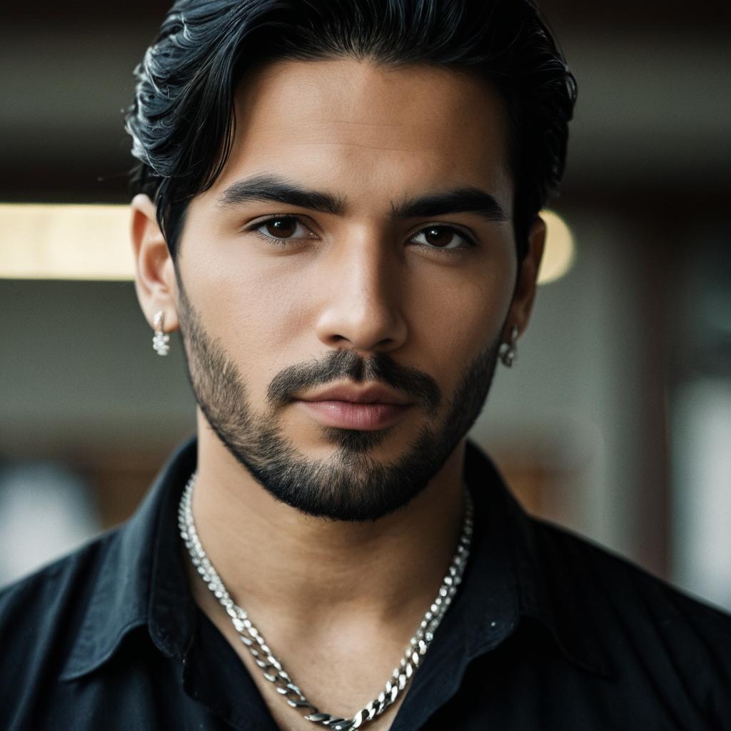 Cinematic portrait of young Hispanic male artist in colorful graffiti wall bathed in soft sunset glow, Fujifilm emulation, vibrant colors, 4K ultra-realistic detail.
