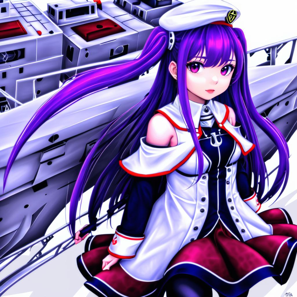 Digital anime-style illustration of a young female character with long purple hair styled in two side ponytails, bright purple eyes, and red eyes. She is wearing a white naval-inspired outfit with a red skirt, black pantyhose, detached long sleeves, a white capelet with red trim, and a white beret hat. The background features a detailed depiction of a military ship, suggesting a naval theme.