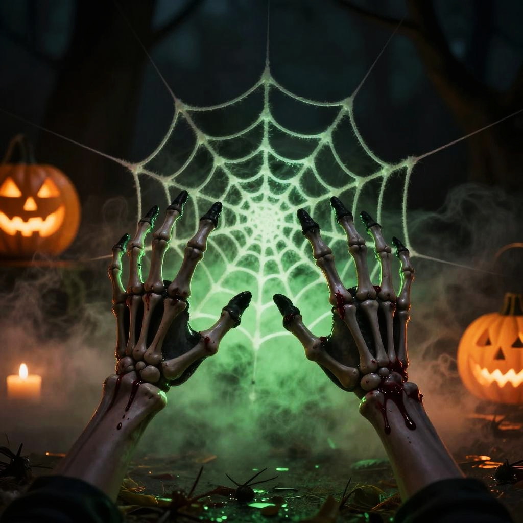 Photograph of spooky, glowing green spider web spun by skeletal hands with black nails, surrounded by jack-o'-lanterns, fog, and dark