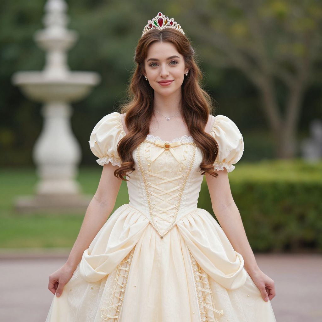 Photograph of a young woman with fair skin and long, wavy brown hair, wearing a white, puffed-sleeve, satin ball gown with intricate lace detailing and a gold brooch at the center. She has a jeweled tiara on her head and is smiling gently. The background features a blurred, lush green garden with a white stone fountain on the left. The woman stands on a paved path, with well-manicured hedges in the distance. The overall scene has a fairytale-like quality, emphasizing elegance and royalty.