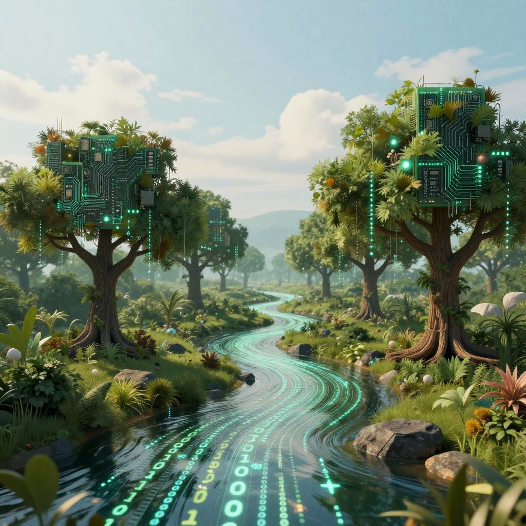 Digital art: Luminous, winding stream with glowing green numbers and symbols flows through a vibrant, futuristic forest with trees adorned with neon circuits. Clear