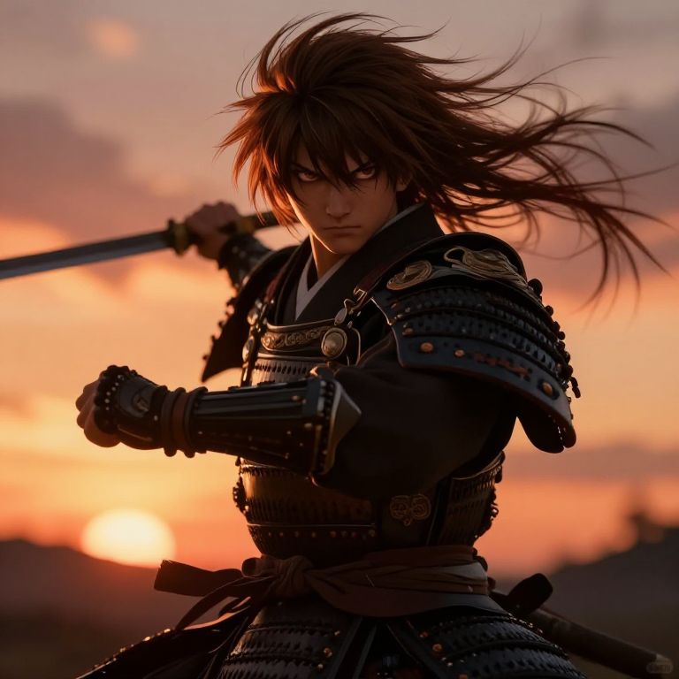 Brown hair anime warrior in traditional samurai armor, dramatic sunset sky behind, wind blowing through detailed hair strands, fierce determined eyes, intricate armor patterns and textures, dynamic battle stance, cinematic lighting emphasizing strength and honor