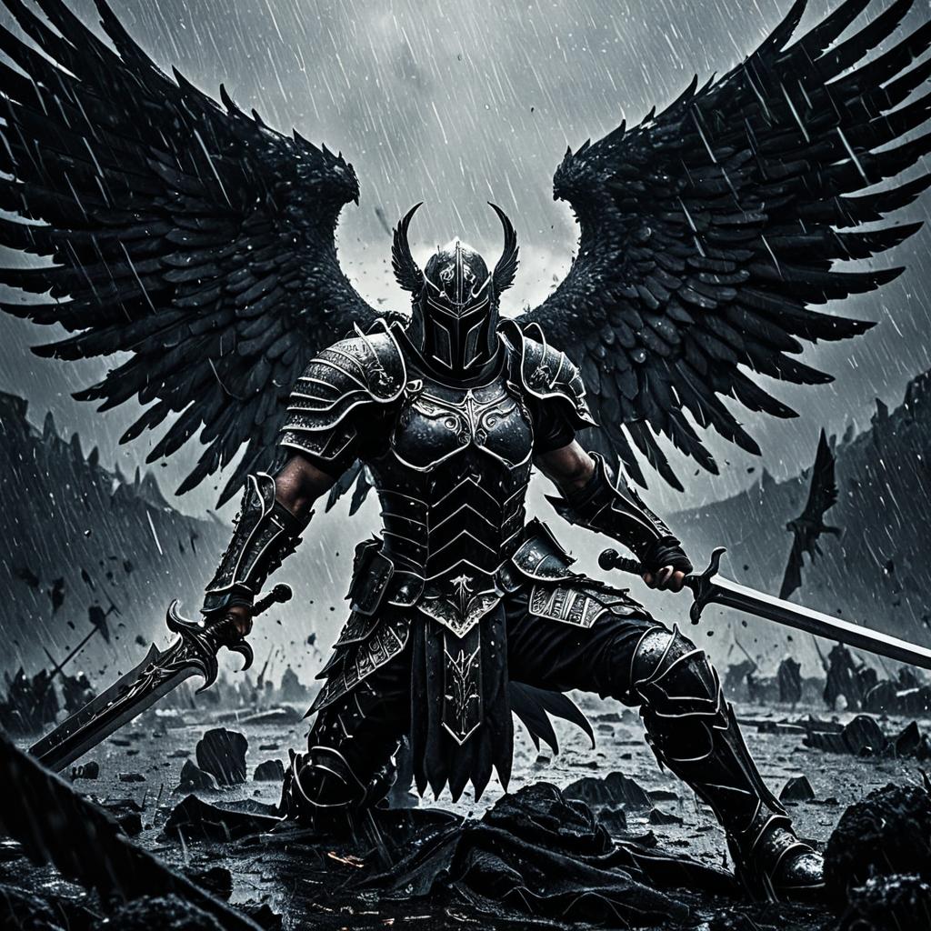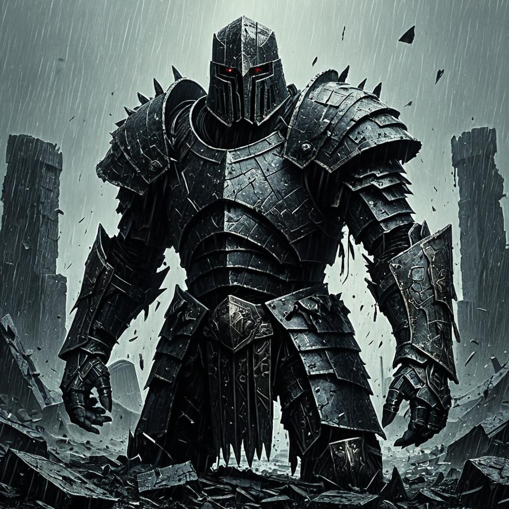 A detailed digital illustration of a shattered ancient golem clad in broken, dark ceremonial armor. The scene is set in a gloomy, rainy environment with an epic battle atmosphere. The golem's armor is cracked and intricate, featuring spikes and legendary design elements. The background shows ruins and heavy rain, enhancing the dark fantasy and brutal mood of the artwork.