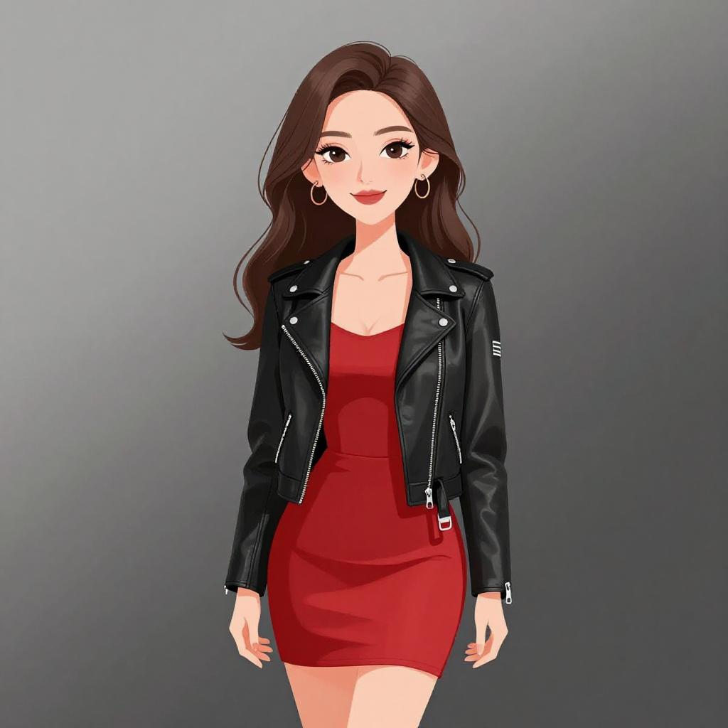 Woman with pretty face and pretty hair. smiling Woman, edgy street style, faux snakeskin jacket in red and black, cropped length, long sleeves, notched lapel, black faux leather high-waisted shorts, paperbag waist with a tie belt, black crop top, straight hair, white studio background --sref 1467