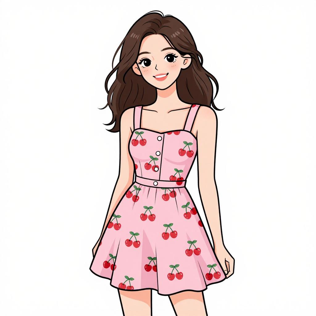 Digital anime-style drawing of a smiling young woman with long brown hair, wearing a pink cherry-patterned sundress, standing against a white background.