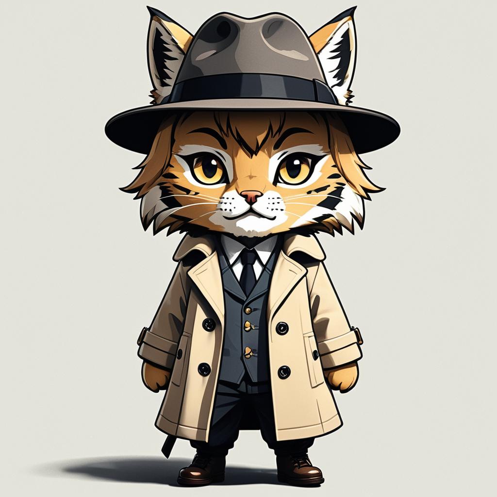 Lynx, trench coat and fedora, chibi anime style, 8K resolution, hyper-detailed, cartoon aesthetic