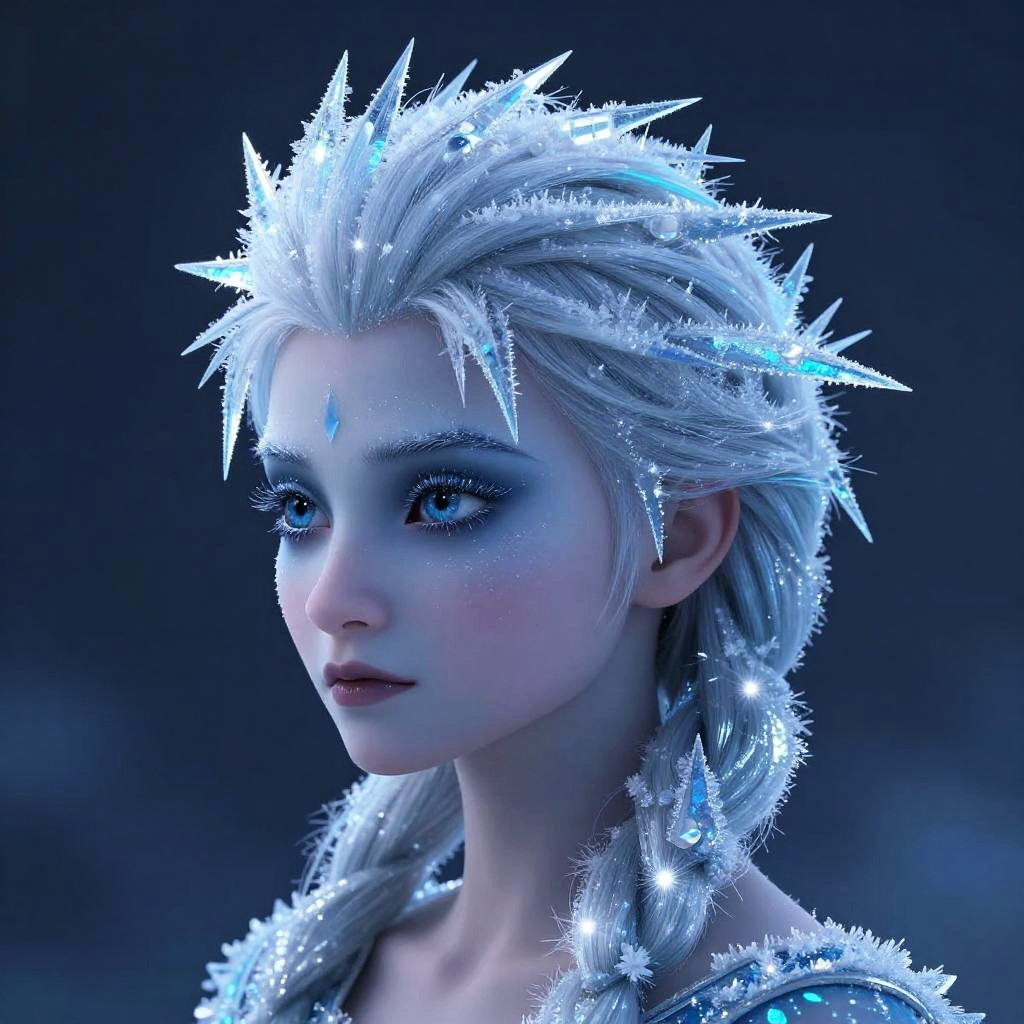 A digitally rendered, fantasy-style portrait of a fair-skinned woman with icy, white hair adorned with shimmering ice crystals. She has large, expressive blue eyes with blue eyeshadow, a small blue gem on her forehead, and light blue lips. Her hair is braided and also decorated with ice. She wears a dark, metallic outfit with icy accents. The background is a deep, dark blue, enhancing the icy theme. The image has a realistic yet magical feel, with a focus on the woman's ethereal, frosty appearance.