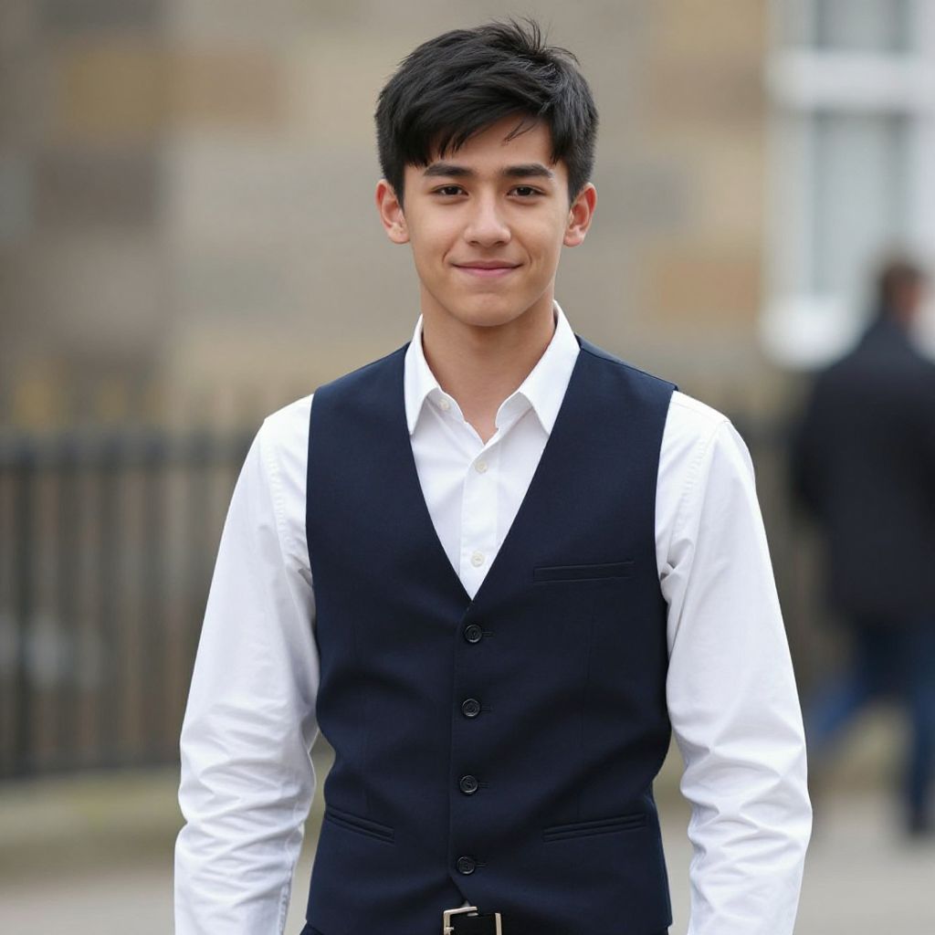 Photograph of a young Asian man with short, dark hair and a small mustache, smiling slightly. He wears a maroon blazer over a white dress shirt, unbuttoned at the top. The background is blurred with green and brown hues, suggesting an outdoor setting with trees and grass. His skin tone is light brown, and he has a slim build. The lighting is natural, highlighting his face and upper body. The overall composition is centered and focused on the man from the waist up.