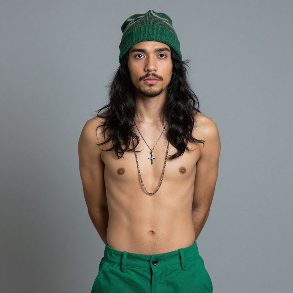 Photograph of a young, shirtless man with medium brown skin and long, wavy black hair, wearing a green knit beanie and green pants. He has a slim, toned physique with small, light brown nipples and is adorned with a long chain necklace featuring a cross pendant. His facial expression is neutral with slightly parted lips and a mustache. The background is a plain, light gray, and the overall style is minimalistic and contemporary. His hands are behind his back, adding a casual, confident stance to the image.
