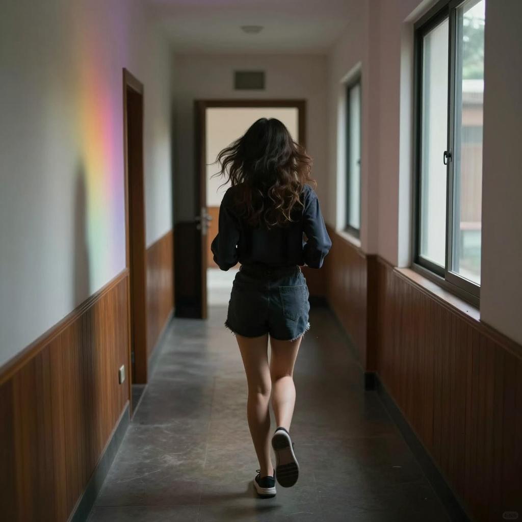 Silhouetted figure with long hair and claw-like hands walking towards a brightly lit window in a dark room. Blue light streams through window, illuminating figure's back. Bag on floor to left. Gravel-like ure on floor.