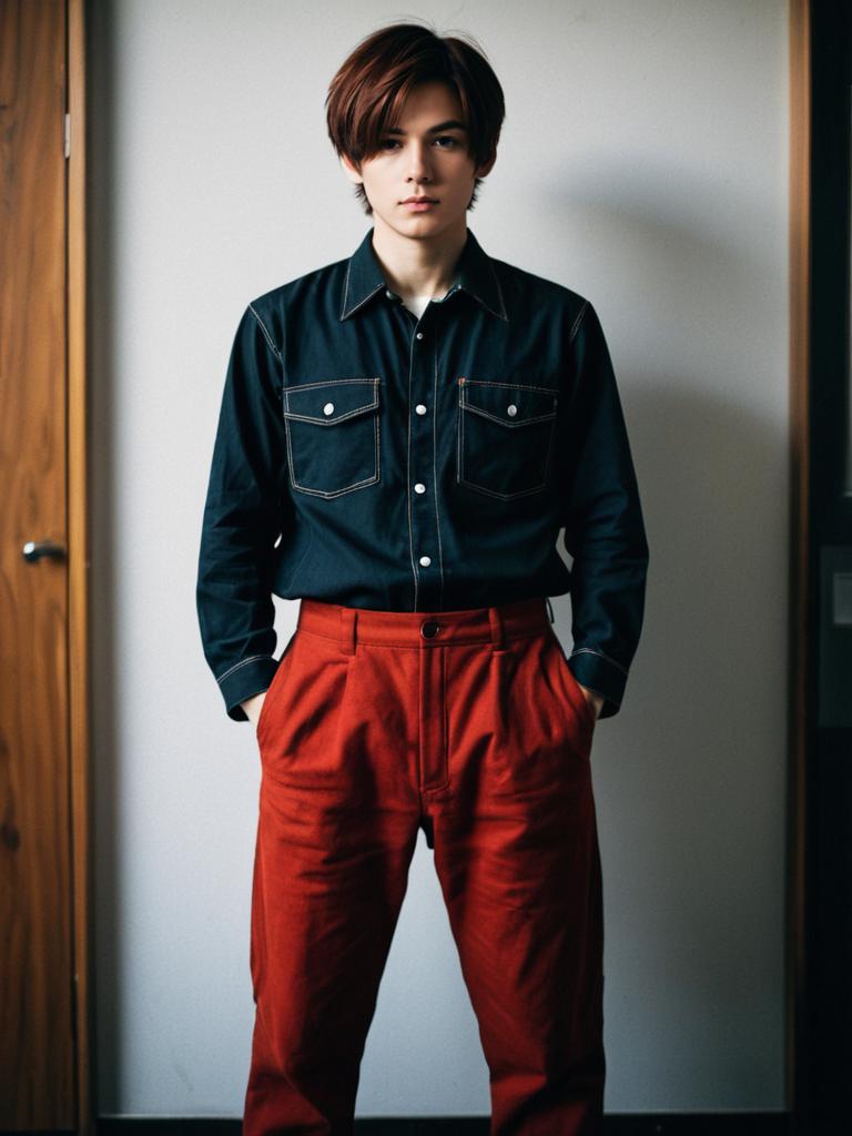 Portrait of a young man with brown hair wearing a black long-sleeve shirt with front pockets and high-waisted red pants. He is standing indoors against a plain wall with hands in his pockets, looking directly at the camera with a neutral expression.