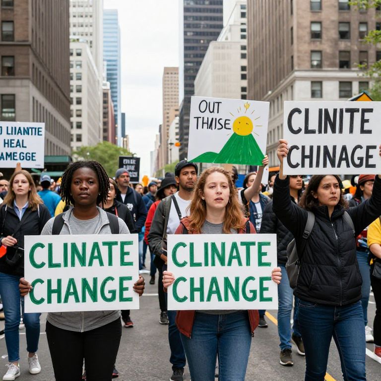 A diverse group of people holding signs advocating for climate change, standing in a busy city street during a peaceful protest, with a backdrop of skyscrapers and a vibrant crowd in the background