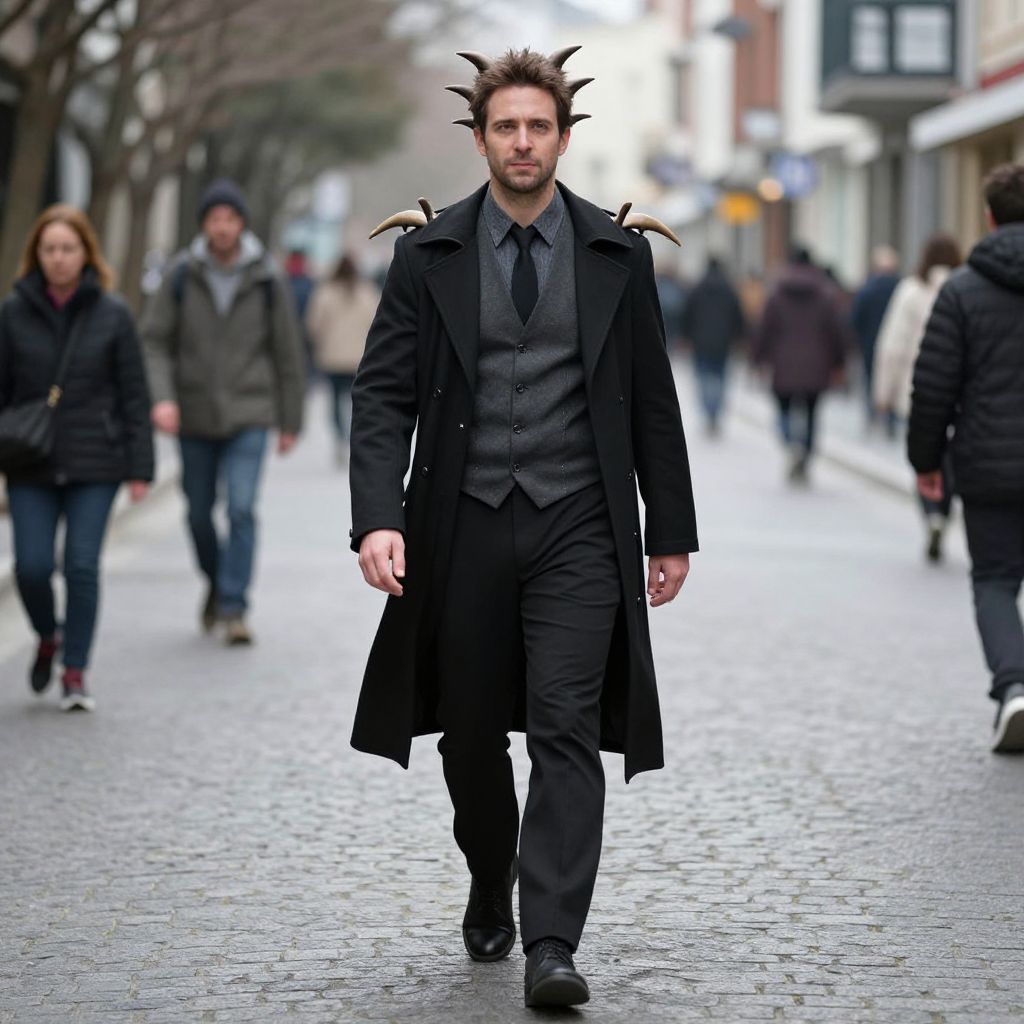 Photograph of a Caucasian man with light skin and dark, spiky hair wearing black, horned headgear, a black suit with a gray vest and tie, and a long black coat. He walks confidently down a wet, cobblestone street in an urban setting with blurred pedestrians in the background, including a woman with red hair and a man in a gray coat. The street is lined with bare trees and buildings, with bright, diffuse light suggesting an overcast day. The man's expression is serious, and the overall mood is slightly surreal due to his unusual headgear.