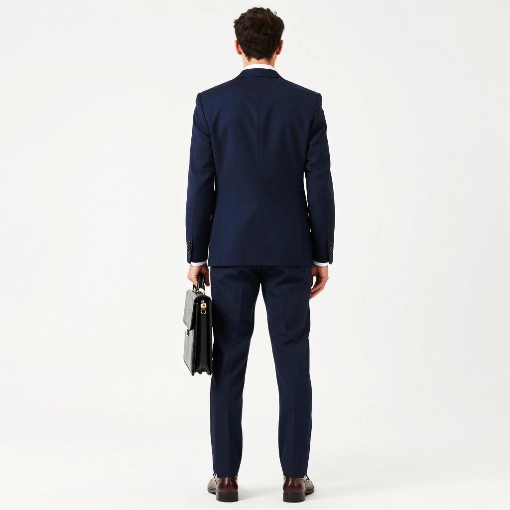 Photograph of a man standing with his back to the camera, wearing a dark blue suit, brown shoes, and holding a black briefcase in his right hand. His short, dark hair is neatly styled. The background is completely white, making the man the clear focus of the image. The overall style is business-like and professional.
