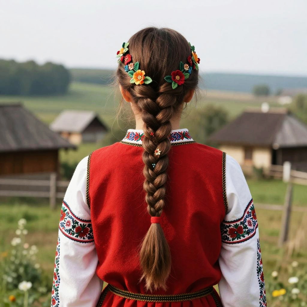 Slavic braids styled with intricate floral patterns, vivid traditional clothing, soft natural lighting, rural Eastern European village background, high detail, cultural essence