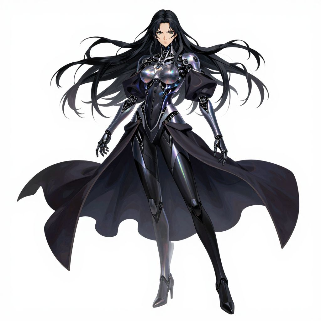 Digital anime-style drawing of a tall, slender woman with long, flowing black hair and piercing blue eyes. She wears a form-fitting, black, futuristic armor with silver accents, a high collar, and long gloves. A long, billowing black cloak drapes from her waist. Her boots are also black and high-heeled. Her expression is intense and focused. The background is plain white, making her dark outfit and features stand out starkly. The art style is highly detailed with a focus on glossy textures and dynamic movement in her hair and cloak.