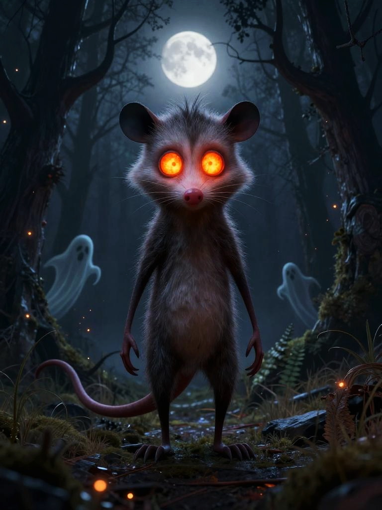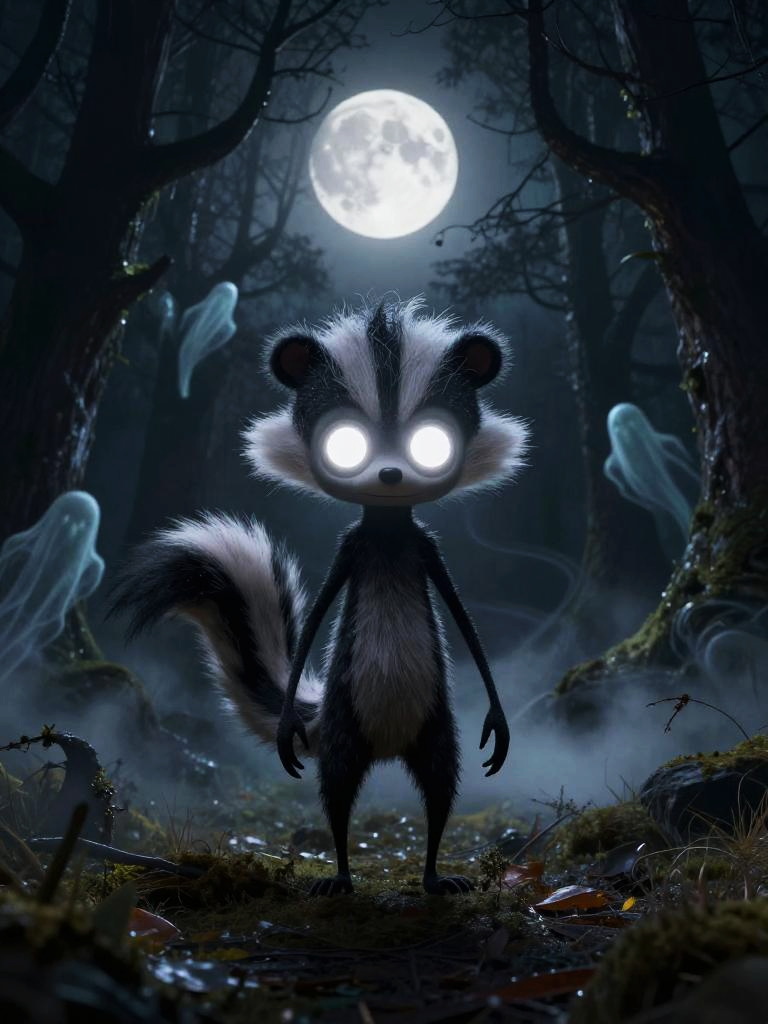 Spooky stylized lemur character standing upright in the center of a dark eerie forest clearing at night, huge glowing fiery orange eyes staring at the viewer, long skinny limbs and slightly exaggerated proportions, surrounded by twisted trees and faint ghostly silhouettes, dusty haze between the trees filling the air, full moon glowing in the background, cinematic wide-angle shot, dark whimsical gothic fantasy style, highly detailed 3d illustration, soft volumetric muted teal twilight, high resolution