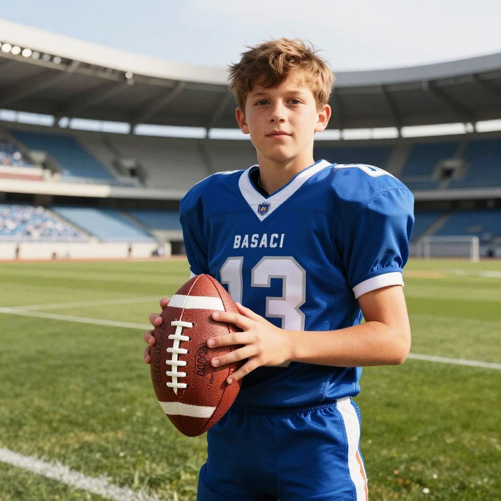 Football Player, boy holding a football ball in a stadium with a stadium in the background
