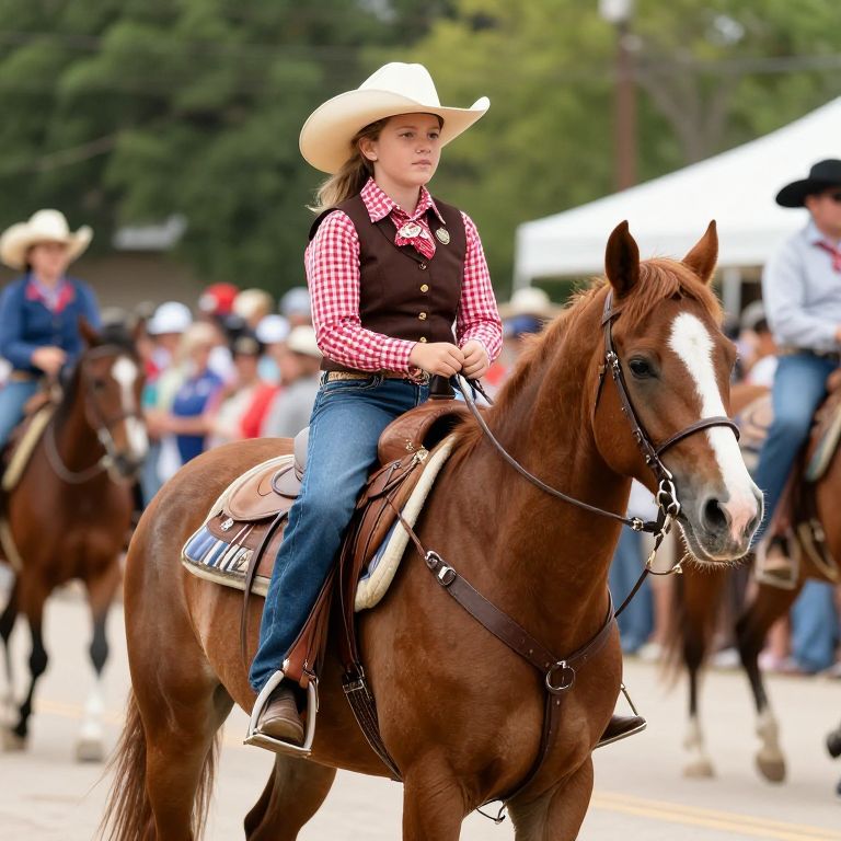 Girl riding a chestnut horse in a festive Pioneer Day Parade, wearing a wide-brimmed cowboy hat, a red-and-white checkered shirt, and a brown vest, with a crowd of spectators and other riders visible in the background.